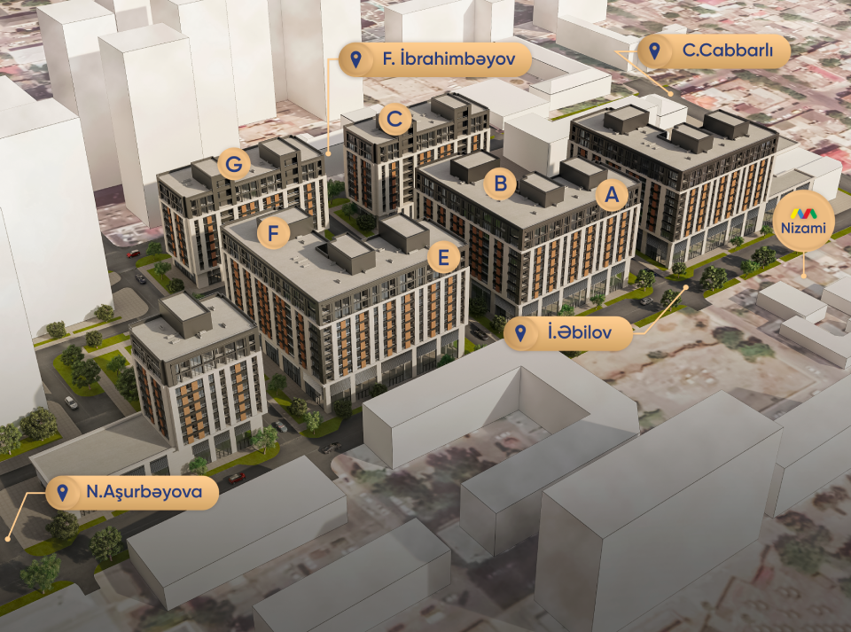 “Nizami City” layihəsi 9 mərtəbəli, 9 bina və 14 girişdən ibarətdir və 2.87 hektar ərazini əhatə edir. Kompleks C.Cabbarlı, S.Salayev, F.İbrahimbəyov, İ.Əbilov və N.Aşurbəyova küçələrinin kəsişməsində yerləşir. Nizami metrosuna, Qış parkına və Fəvvarələr meydanına çox yaxın məsafədədir.