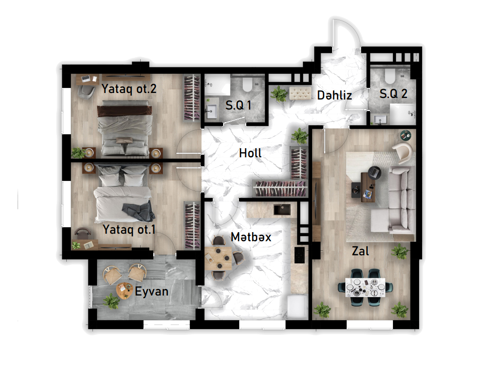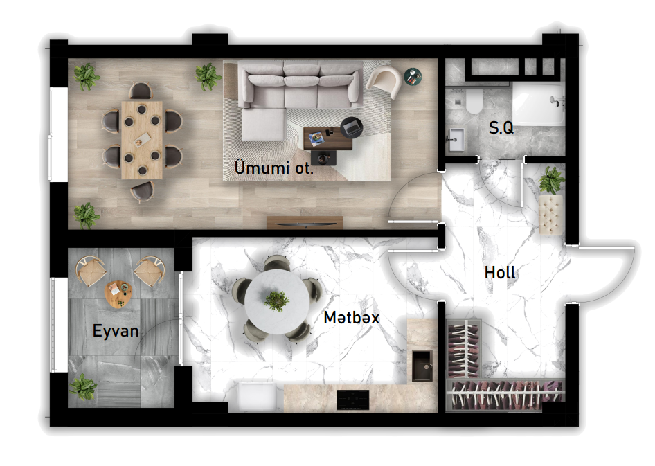 1 Otaqlı mənzil (2 otaq studiya) №4 (C-G)